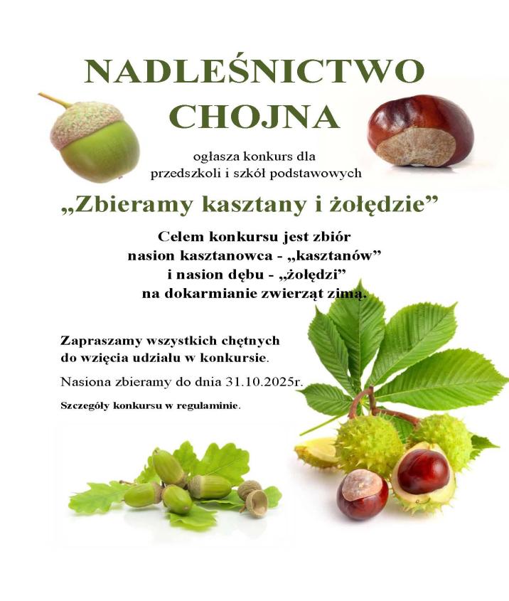 Zapraszamy dzieci z przedszkoli i szkół podstawowych oraz ośrodka szkolno-wychowawczego z terenu Nadleśnictwa Chojna do udziału w konkursie „Zbieramy kasztany i żołędzie”.